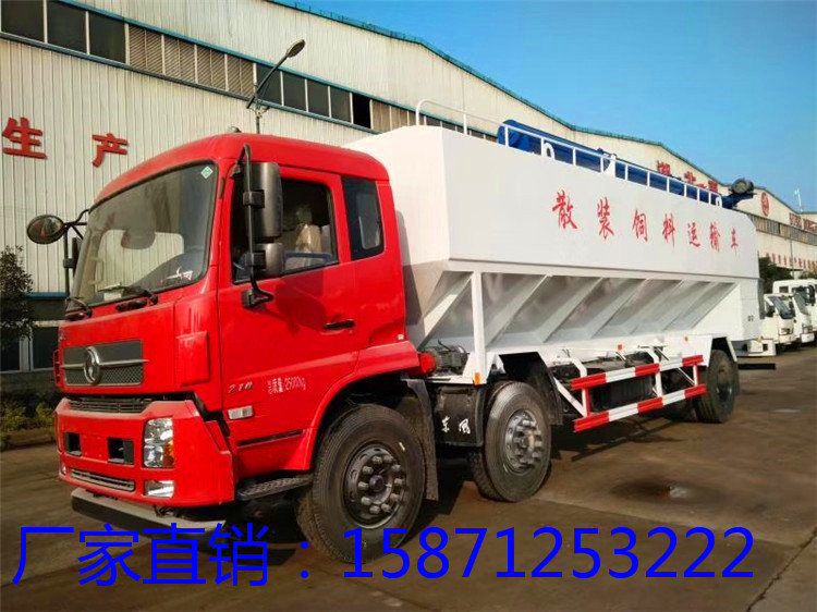 散装饲料车的饲料罐架设在卡车的底盘上,专用设施由罐体总成、输送系统(水平卸料系统、垂直卸料系统以及活动卸料系统组成)、散装饲料车罐液压系统(高压油泵经管路与分配阀连接该阀的三个输出端分别是转角液压马达、升降油缸以及串联在一起的水平卸料、垂直卸料、活动卸料液压马达)、散装饲料车罐电动系统、气动分仓机构等组成。在罐体底部设有闸门,在闸门下面装有水平螺旋输送器(俗称水平搅笼),由取力器由汽车变速箱输出动力驱动,再传动高压油泵以驱动液压系统,散装饲料车罐液压马达通过传动装置带动水平螺旋输送器的叶片轴及叶片旋转,经活动输送系统(俗称活动搅笼)以将饲料输出。车顶平置的一根活动卸料绞龙可自由回转和抬升,运输时顶部的螺旋管平卧在罐顶;卸料时则抬起,散装饲料车罐使管端的出料口与畜禽饲养场贮料罐顶部的进料门相接、对准,完成卸料。